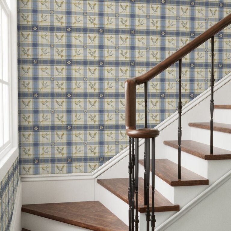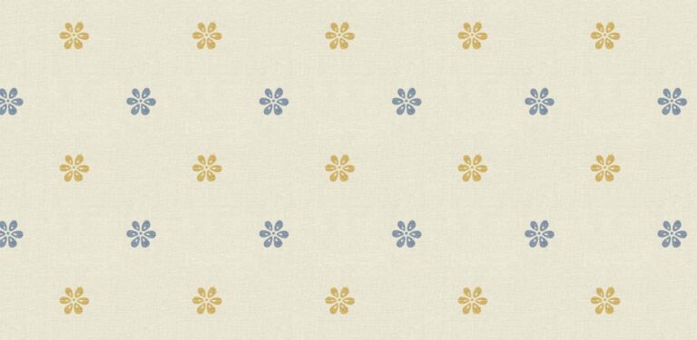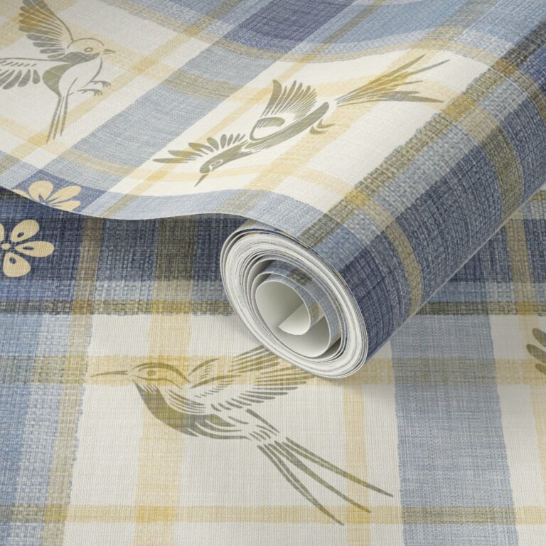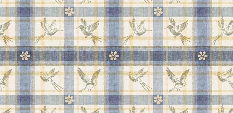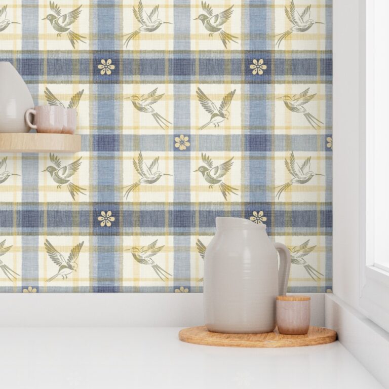 Soft country checks and stripes with birds and flour sack daisies in oat buttermilk denim blue & wheat gold—nostalgic cozy prairie charm.