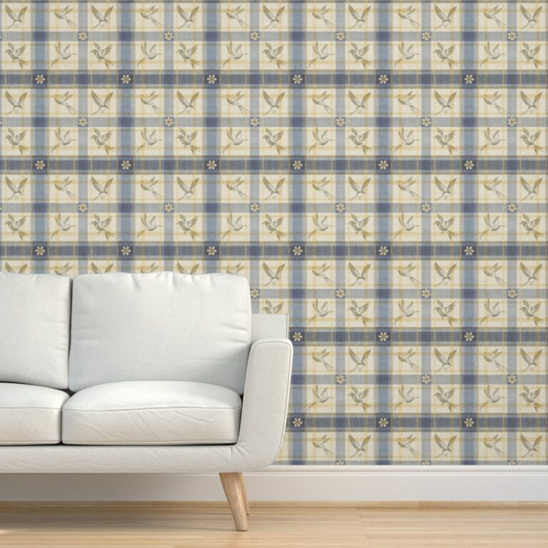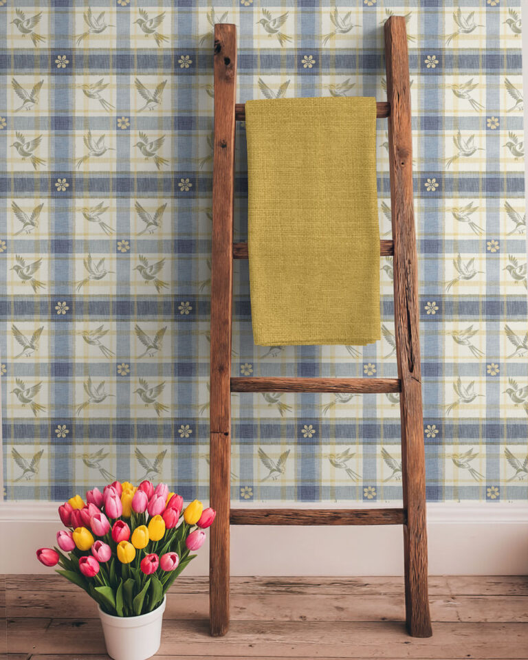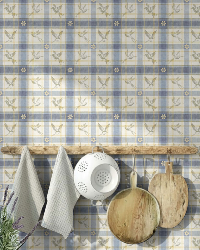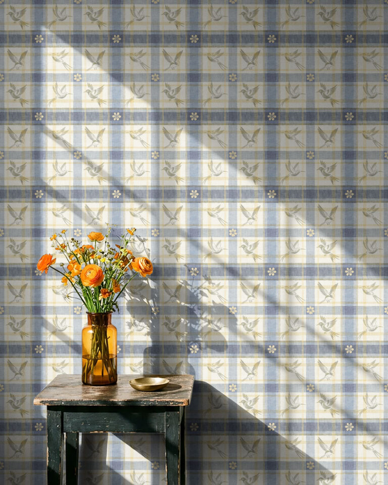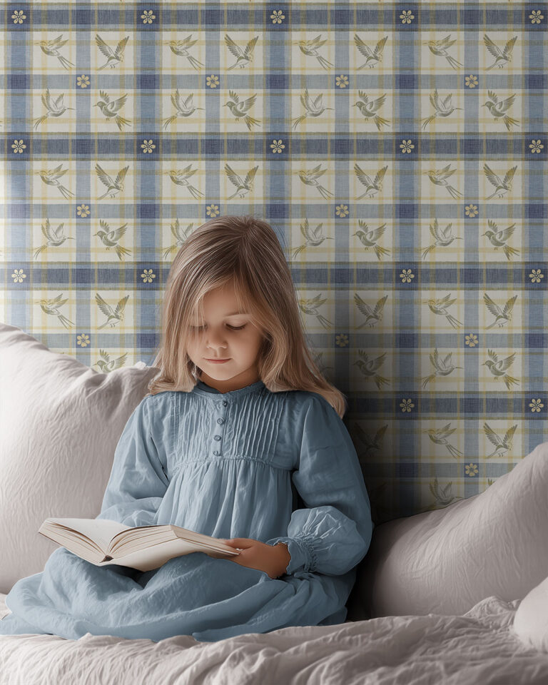 Nostalgic Checks & Daisies with Birds Oat Buttermilk Denim Blue Wheat Gold