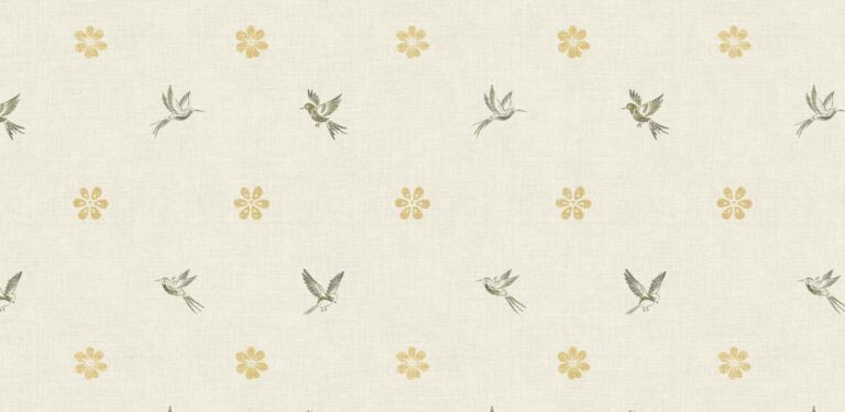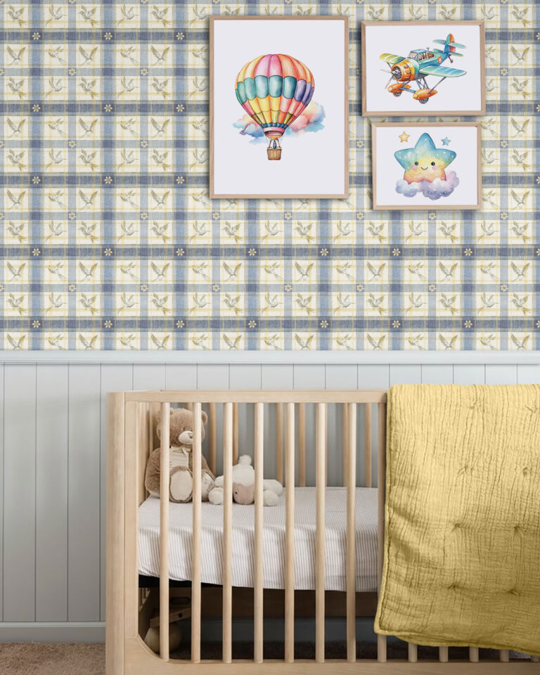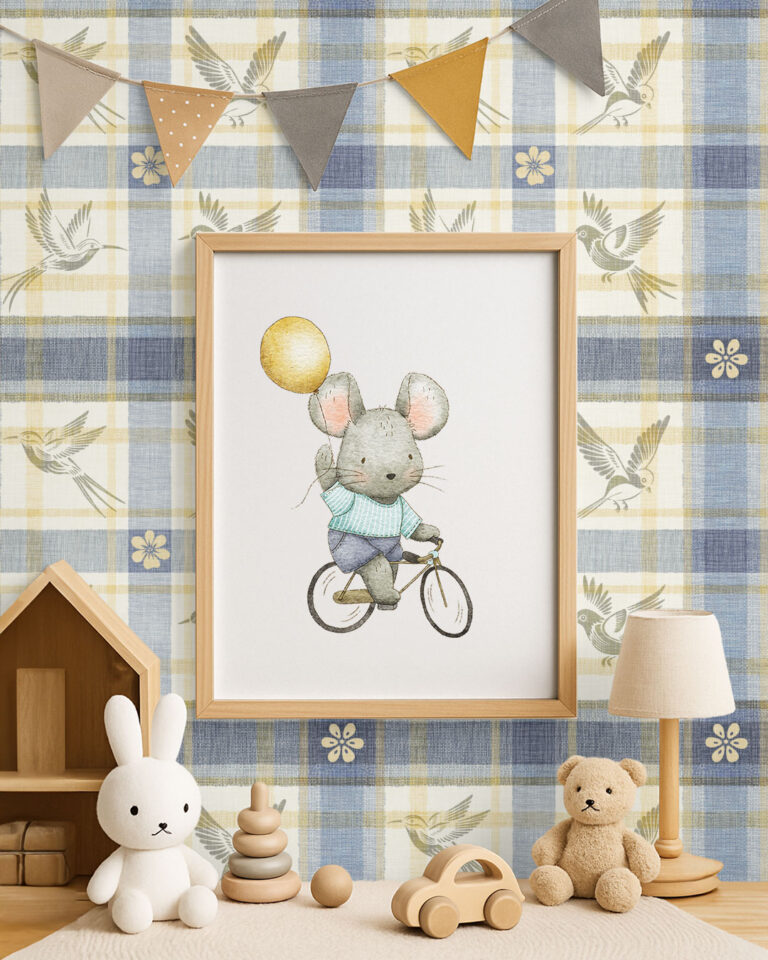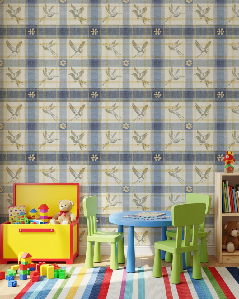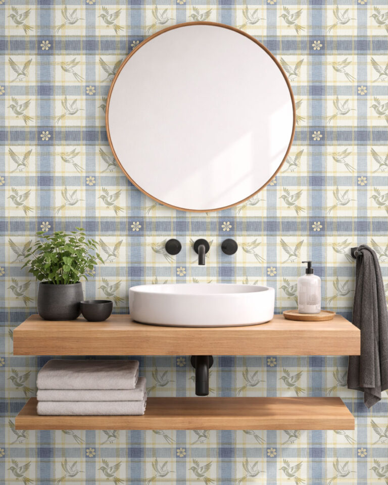 Nostalgic Checks & Daisies with Birds Oat Buttermilk Denim Blue Wheat Gold