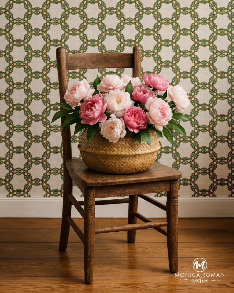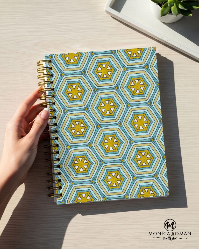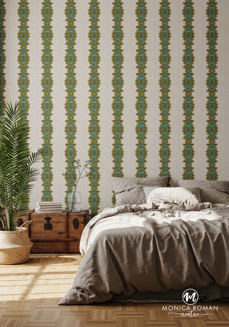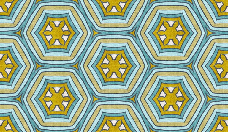 Retro-inspired floral and geometric designs in teal, turquoise, olive, and cream with spring and summer appeal.